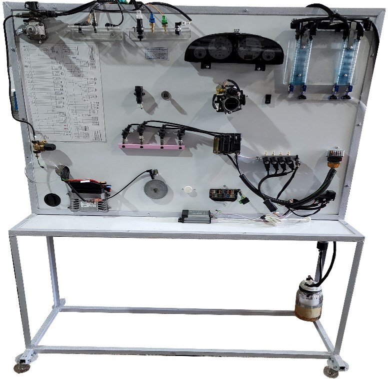 – دارای سیستم مدیریت سوخت رسانی SEIMENS به همراه پمپ بنزینIn tank با رگلاتورتنظیم فشار سوخت سر خود، دارای فلایویل شبیه سازی شده با اینورتر جهت تغییر دور فلایویل، دارای پشت آمپر جهت نمایش پارامترهای دور موتور، کیلومتر،دمای آب و نمایش سطح سوخت – مدار هوا رسانی دارای دریچه هوای ورودی به همراه تمامی سنسورهاو عملگرها- دارای سوئیچ اصلی، دسته سیم های اصلی، جعبه تقسیم کالسکه ای وجعبه فیوز اصلی و بخش سوخت رسانی گازیCNG دارای پرکن گاز، شیر سر مخزن، کمپرسور باد جایگزین مخزن گاز(جهت بالا بردن ایمنی کار با تابلو آموزشی)، رگلاتور زیمنس، مجموعه ریل سوخت گاز به همراه مجموعه نازل های گاز دارای شبیه ساز طراحی شده توسط تیم فنی این شرکت که قابلیت پاشش هوا به جای گاز را به صورت زنده ایجاد کرده است.